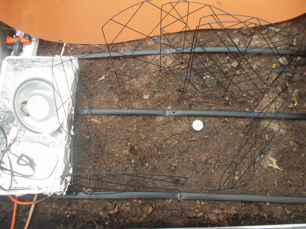 Heat cables have been buried and running for at least 24 hours prior to planting and the white circle is actually a soil thermometer which is reading 72F (22C) which is the ideal soil temperature.