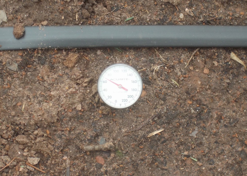 When heating the soil it is important to remember the ideal soil temperature is less than the ideal air temperature. The target temperature for the soil (root zone) is 72F (22C) and based on this thermometer my heating cables have elevated the temperature of the root zone to 70F (21C) which is ideal. It takes about 18-24hr for the soil temperature to stabilize so it is important to test the cables before burying and also before the plants go in. If the cables are installed and run for a few days (or even over a week or more) this can help flush out potential insects and reduce the chance of damage to a new transplant. However, this is not always possible but making sure everything is good to go before the plants are planting can save a lot of frustration.