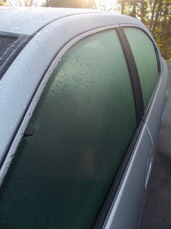 While it may look like a mist on the car, this morning there was a frost, and the car as turned into an ice box. A frost this time of year is not uncommon, but just shows the importance of having a system for heating in place and making sure to test it ahead of time. When the plants were inspected today, both were nice and warm indicating all of the heating sources that were installed were functioning as intended.