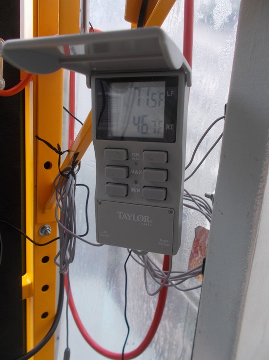 The left sensor (LF) is in the structure and the right sensor (RT) is outside. After the heater has come on while adjusting the temperature setting there is almost a 25-degree F difference!