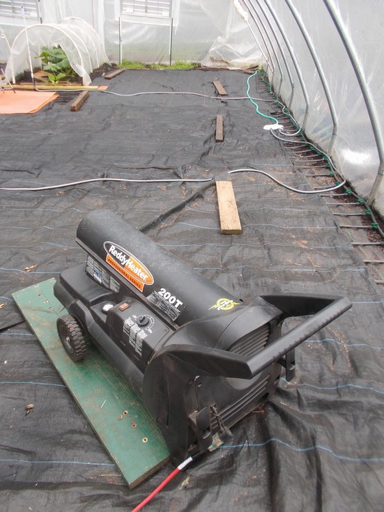 This provides an idea of the general direction the heater is placed. It is pointing downhill on a 45-degree angle that is in the general direction of the plant, but not directly at it to prevent heat damage. There are also some walking boards set-up along the perimeter on the weed block to help reduce soil compaction as I work my way around the plant/structure.
