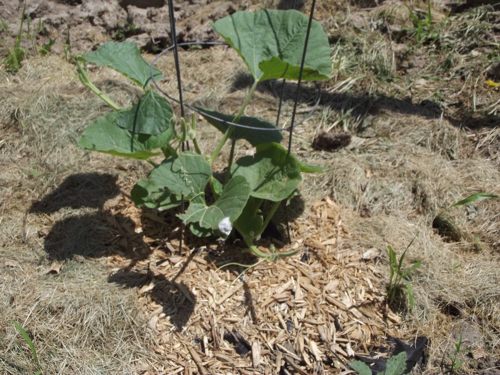 Some (epletive deleted) critter munched on a couple of the long gourds. Electric fence with the extra hot wire didn't stop it. And the baler twine lines I added were just chewed though. There mist be a short in a wire somewhere. My wife Lu Ann found some Liquid Fence repellent at the landfill swap shop, a $40 bottle for free. I applied some yesterday evening and have enough left for 3 more applications.