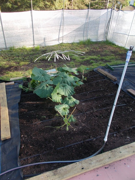 Five days after the indoor plant with all of the special additions (lighting and carbon dioxide) the outdoor plant has out grown its cold frame. In the background the supporting PVC pipes can be seen which makes for easy storage when the cold frame structure is not needed. The soil has been raked and leveled since vine burying will soon be occurring.