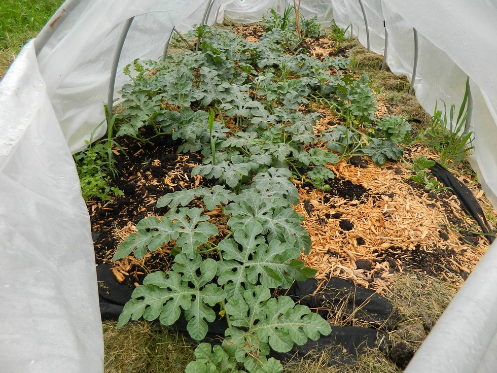 Watermelons are about to break out of the hoop house.