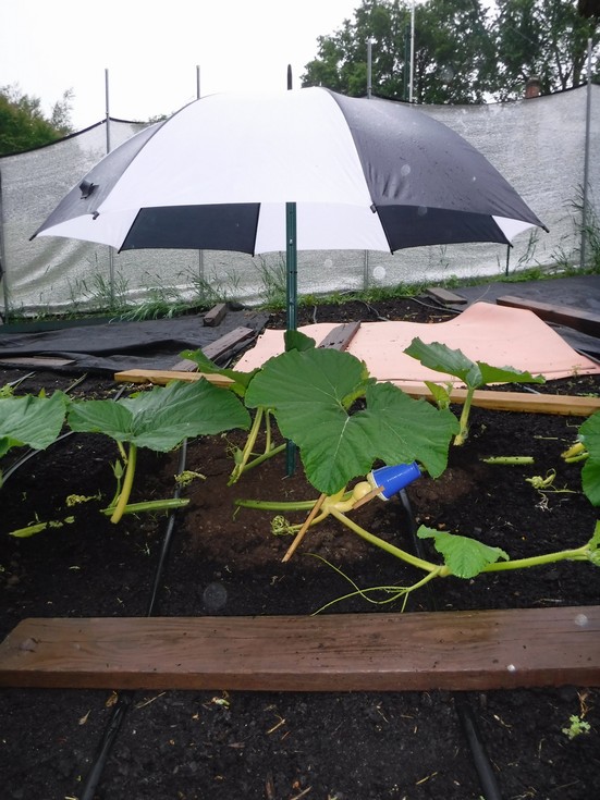 Umbrellas offer some great benefits� 1.) Shade flower 2.) Keeps pumpkin and flower dry 3.) Allows Anthesis to be applied in the rain 4.) Provides some hail protections (I have seen this first hand.)