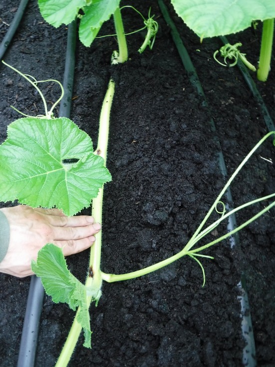 Here the vine is being placed into the trench and held there before the soil is placed on top. I do this with my left hand and this is the hand that I also do not have a glove on because this is my detail task hand. This is the hand that I apply the rooting hormone with, pinch off tertiary vines and also flowers (depending if I have a pollination set or not), all tasks that require precision.