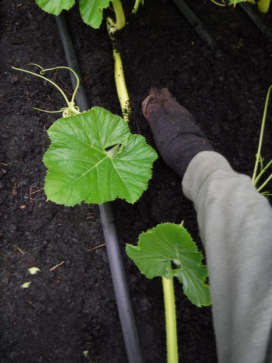 Here I use my right hand which has a very basic �Brown Jersey Landscaping/Material Handling/General Construction� glove that I use to push the soil over the vine. I wear the glove only on this hand as this does the actual soil contact and it helps keep my hand a little cleaner.