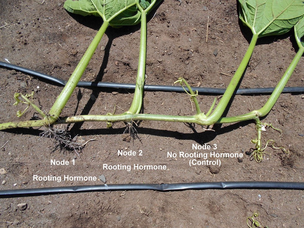 This vine in the image did have time to mature and I have conducted similar tests of rooting hormone (CloneX gel) vs no rooting hormone vs other rooting hormone gel brands vs other rooting hormone substances in a hydroponic setting. A hydroponic setting was chosen to try and reduce the amount of variables as water conditions (ppm, temperature and pH) could be continually monitored. Giant pumpkin plants were used which were clone cuttings from a greenhouse grown plant for the experiments. CloneX rooting hormone had the quickest rooting time and most branching.
