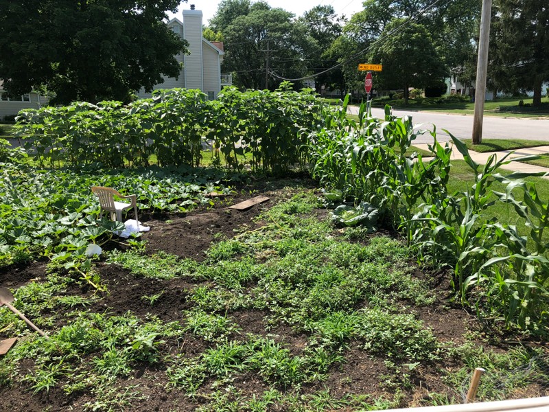 Corn, sunflowers, and weeds are doing pretty good. Rabbits were hungry for the sunflowers this season. Lots of transplants to fill in the gaps.