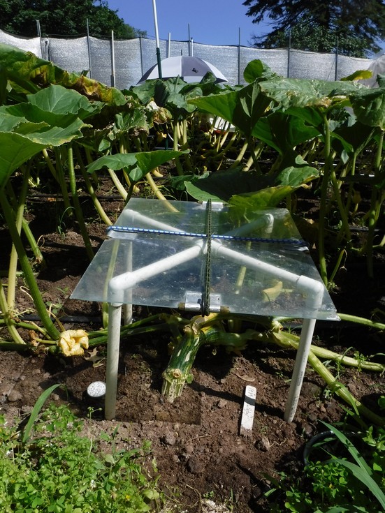 Keeping the initial plant site dry helps reduce the chance of rotting, especially since there are over head misters running for cooling. This is a PVC structure that supports a clear glass sheet that is held in place by bungee cords. The clear glass not only allows for easy inspection it also provides sunlight penetration which can also help reduce the chance of issues.