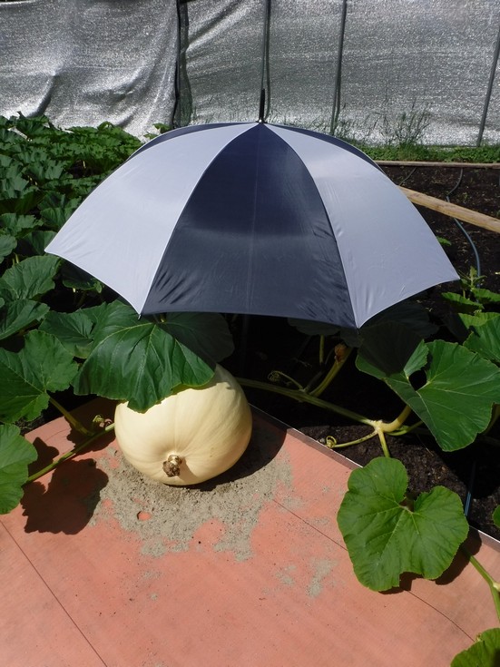 This shows my Outdoor 1989.5 dmg Daletas �17 which has been prepared for the season. The umbrella has been up since before it was pollinated, but what I have put the time into recently is the under pumpkin protection. While the sand and mill fabric are visible there has been special care taken to what is below what is visible in addition to ensuring the proper position of the pumpkin. Note the mill fabric is not fabric, but is actually a plastic belting material that allows water to pass through but is tough enough to prevent mice from eating through.