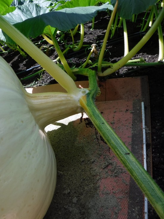 There has been great care taken from the moment the pumpkin laid down to ensure there was proper positioning in anticipation for the growing pumpkin. Maintaining the perpendicular position and pulling the pumpkin back helps create this space between the pumpkin and the vine. The vine has had minimal tension on it which is evident with the horizontal position of the stem.