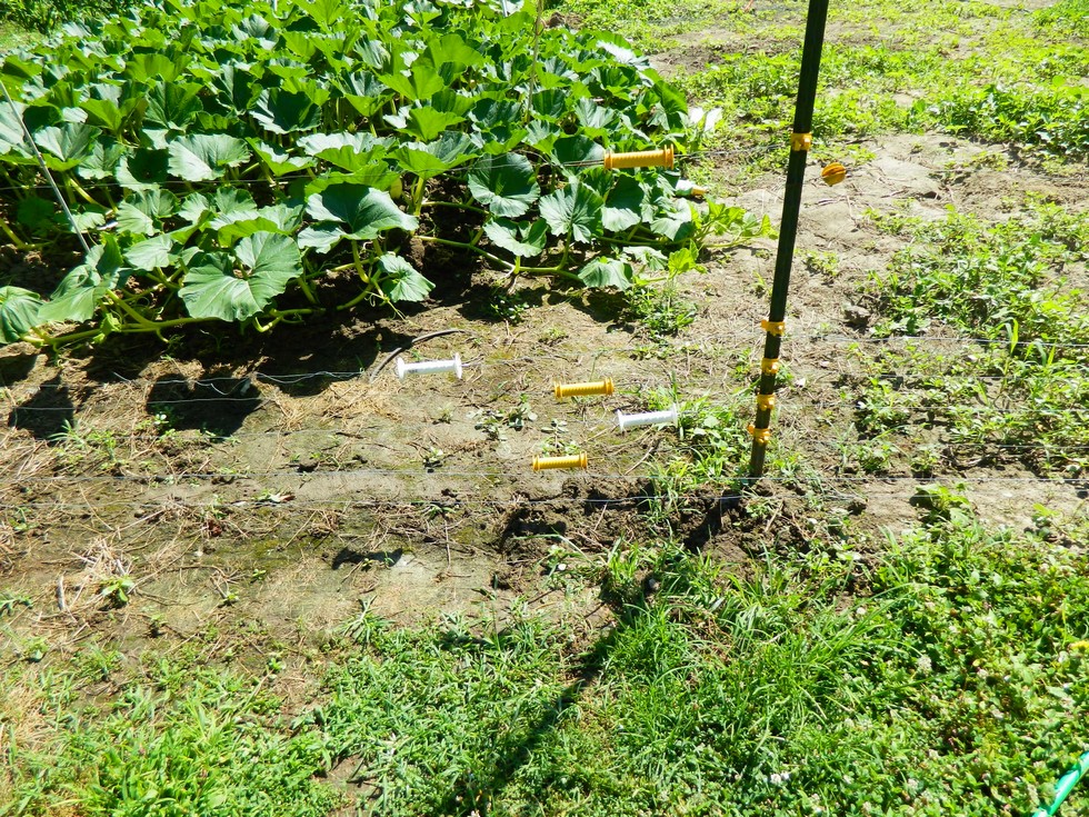 Here is the electric fence set-up. 2 low wires on the outside, then 4 low wires on the main fence. One more hot wire and 2 higher baler twine lines to deter the deer. It is stopping the deer, coons and groundhogs, but rabbits run right through it.