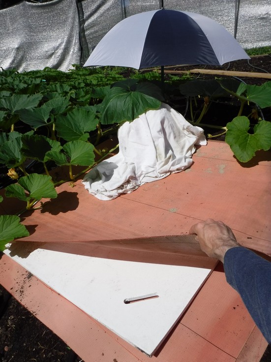 Well under the pumpkin in direct contact with the ground are two layers of mil fabric. The reason for the double layer is to create a surface that can easily move in the future if the pumpkin needs to be repositioned.