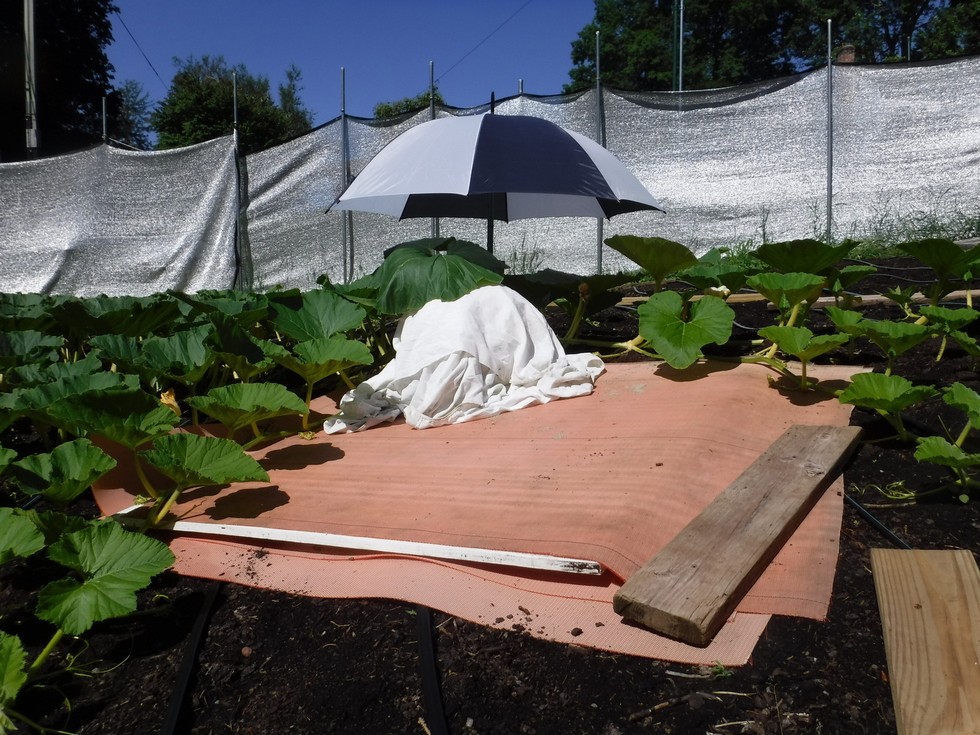 Here is the full system put in action. With the under pumpkin protection this will provide an even surface for the pumpkin to grow on and also makes it easy to move the pumpkin to ensure proper positioning as it grows. The pumpkin itself is covered with a simple white sheet to shade it from the sun. I do try and keep the leaf that comes out of the stem to vine juncture as this helps shade the pumpkin, holds the sheet and provides a short distance for newly formed sugars to travel to the ever growing storage organ.