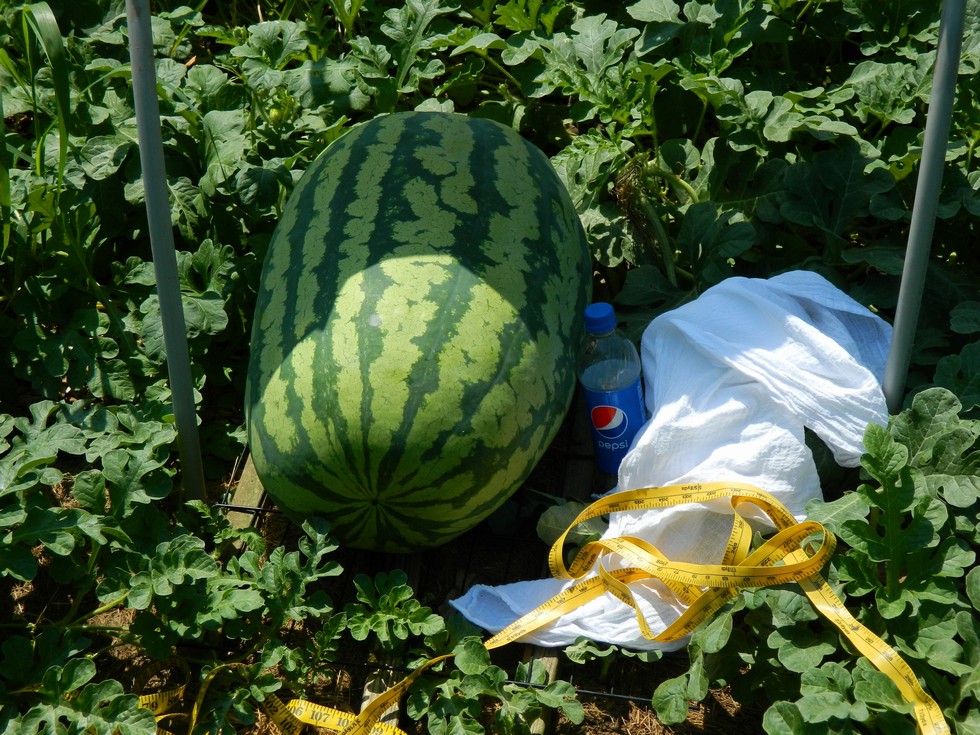 This looks better, our best watermelon. Taped 135", 73.5 pounds by the chart. With 74 days until Anamosa Pumpkinfest, This should easily break my personal best of 115 pounds, If we keep it healthy and safe from critters. I credit my extensive soil preparation and the extra long hoop house for getting it through the cold spring.