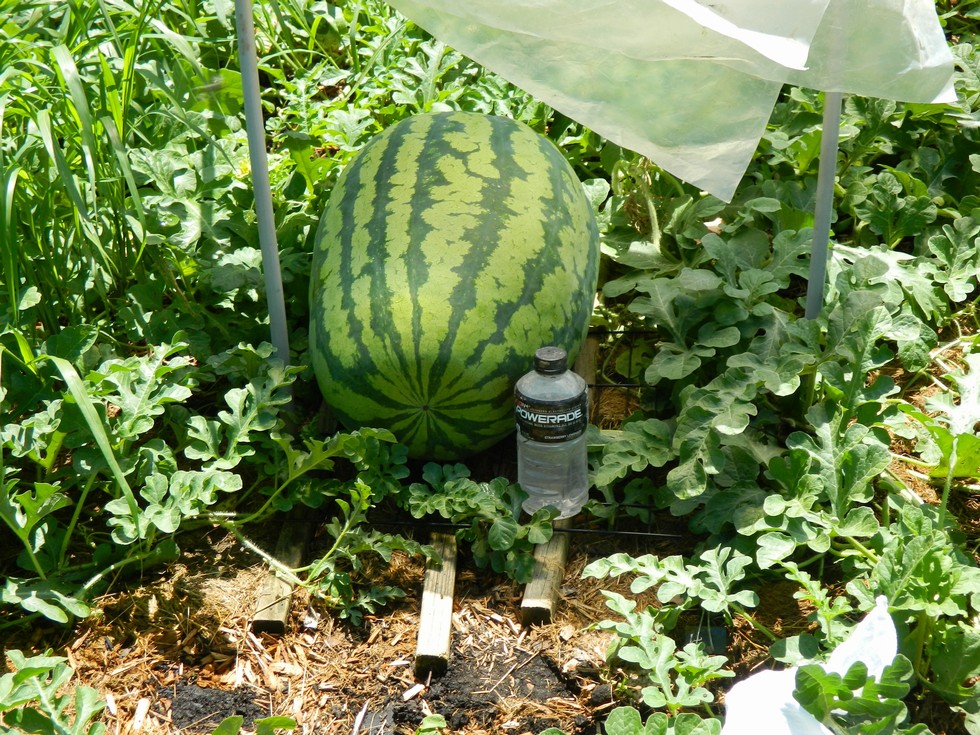 Our best watermelon measured 148", 95# today. That is a 21.5# gain in 6 days. Not too bad. In another 6 days it should beat my personal best. I hope it can keep this up through August and I might have a chance at breaking 200#. The foxtail is growing through gaps in the weed fabric. I am afraid it will pack the soil too much or damage roots pulling it, so I guess I will let it grow. I can always add extra water and fertilizer to make up for what it takes.