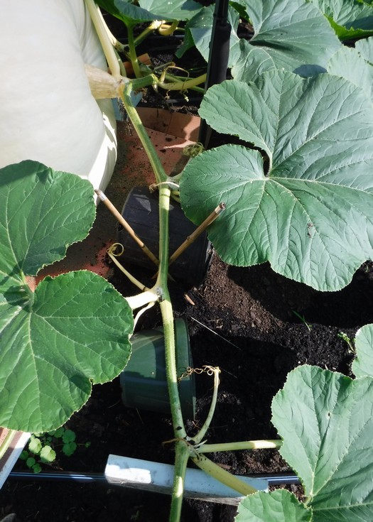 Since this pumpkin is getting so tall I need to start blocking up the main vine early to reduce the stem stress. I put bamboo stakes in an �X� pattern to help support the vine in addition to plastic flower pots to help provide support and a little upward pressure on the vine.