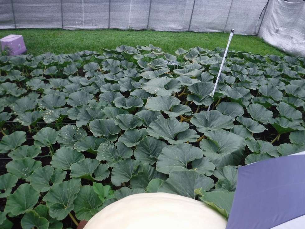 This is the older growth, but it is aging very well with minimal damage or signs of aging. This plant went in the ground back on April 21st, so the overall health is impressive. The longer the leaves can be kept in this good health the longer the plant can push the pumpkin.