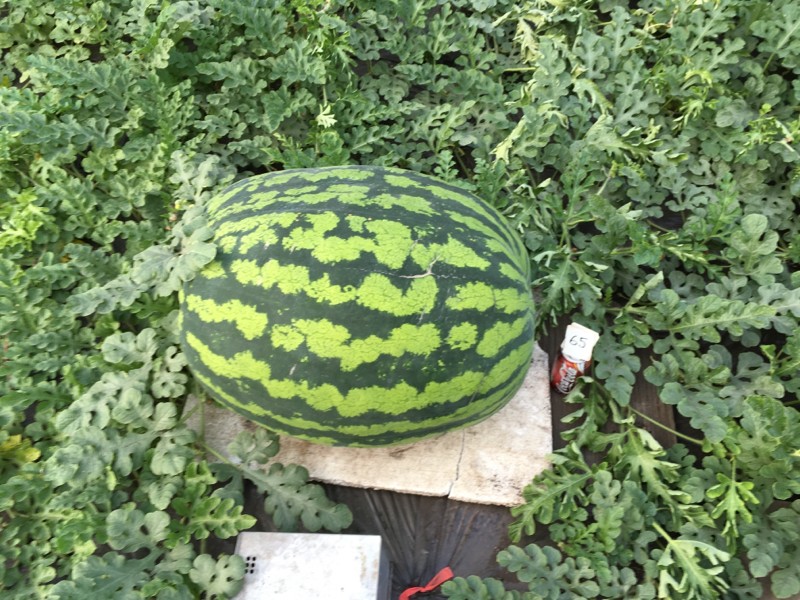 327 Kent watermelon still growing 65 Dap 75� ish. The rain got in from some holes from hail last year and sat on the plastic causing some vines to rot. I�ve pre placed my vine with the fruit on it on foam blocks. So far so good.