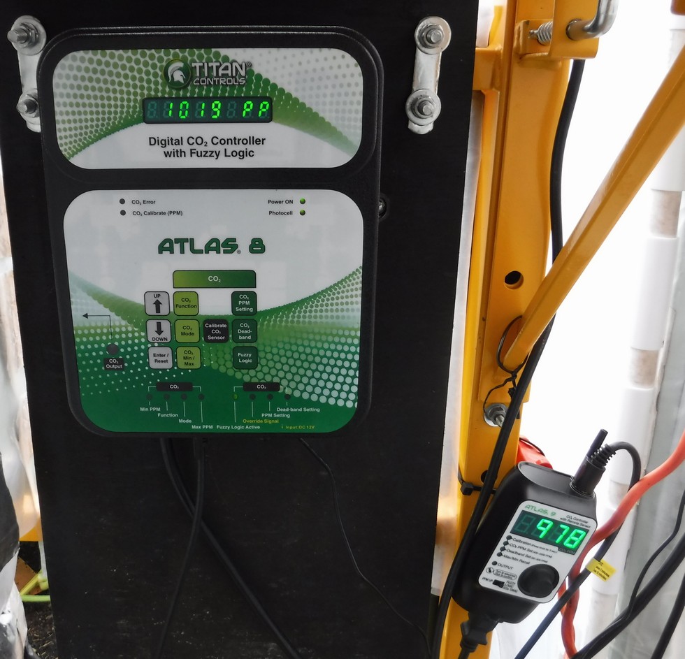 The smaller controller in the lower right of the image (Atlas 9) has a simple but important task of maintain CO2 levels of only 400ppm which is the atmospheric level. This system is not connected to the venting system, but the sensor does have a photocell, so it will only dose during daylight hours. So, even if the Atlas 8 controller is off due to venting this system (Atlas 9) will help ensure the plant never experiences CO2 levels that are below atmospheric levels even if the plant is actively consuming CO2 at a high rate.