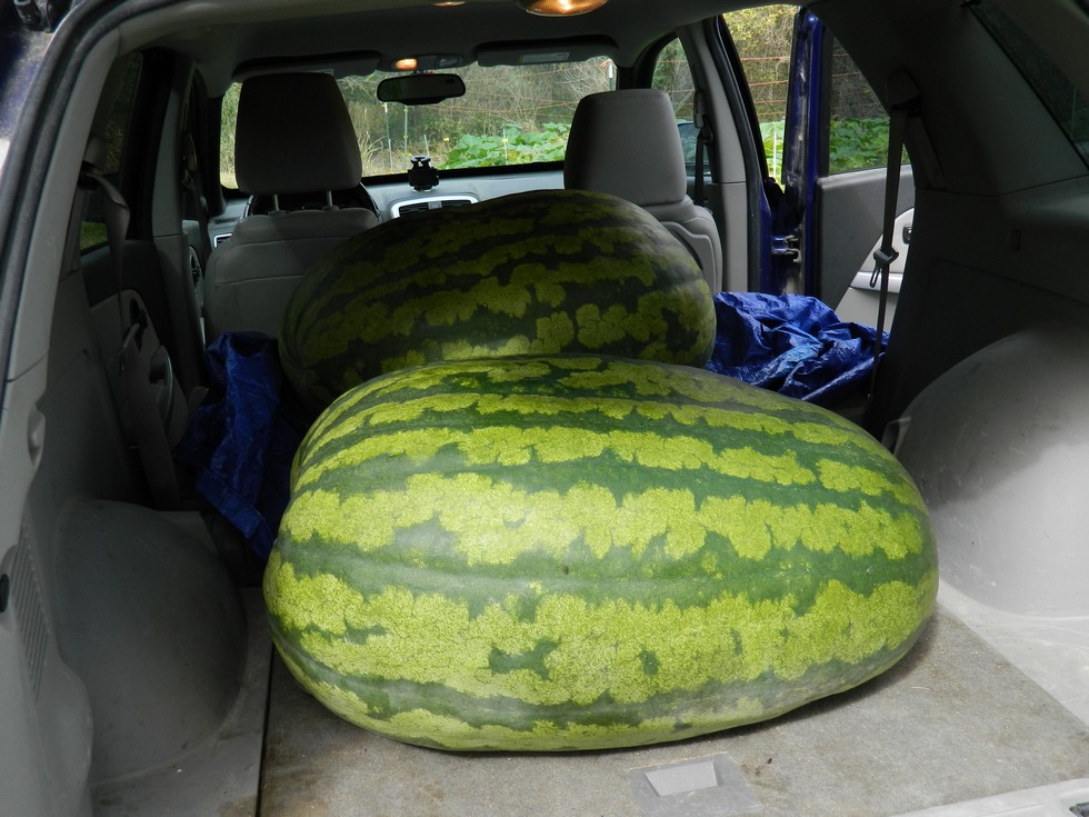 Back of the Equinox filled with 2 watermelons.