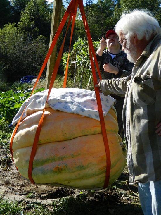 Trying to keep the pumpkin from spinning and tangling the chains. It took a couple tries to get the tripod high enough to clear the bed of the truck, but we finally got it loaded. You can see from the angle of the straps that we just hooked them right to the hoist hook without a lifting ring. It works up to 1000#, but we really need to get a ring. And we need to build a new tripod. The wood we had was not very good to start, and it is getting very old.