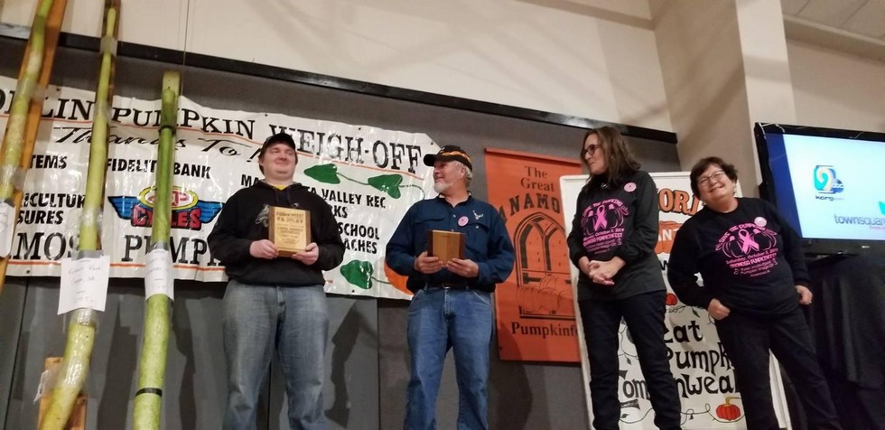 The Jones County watermelon top growers, Jacob McWilliams 2nd, Rusty Caspers 1st. Awarding the Jones County prizes were Jill Parham, the newest inductee into weigh-off Hall of Fame, and Nancy Norlin.