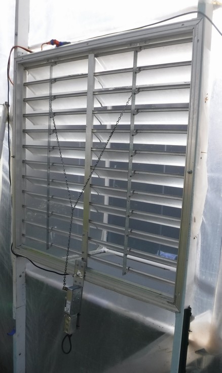 This shows the final set-up for my outside air venting system. If you look in the middle on the lower side of the shutter, you will notice an electric motor. This was connected to a thermostat that would engage the motor when the temperature reached about 85F. While there was no fan to assist the air coming in when the thermostat was engaged there were two vents opening at the same time as the upper vent and the exhaust fan would come on at the same time. This created a flow through of air that allowed for efficient cooling with minimal loss of CO2 that was being added to the environment below the pumpkin leaf canopy.