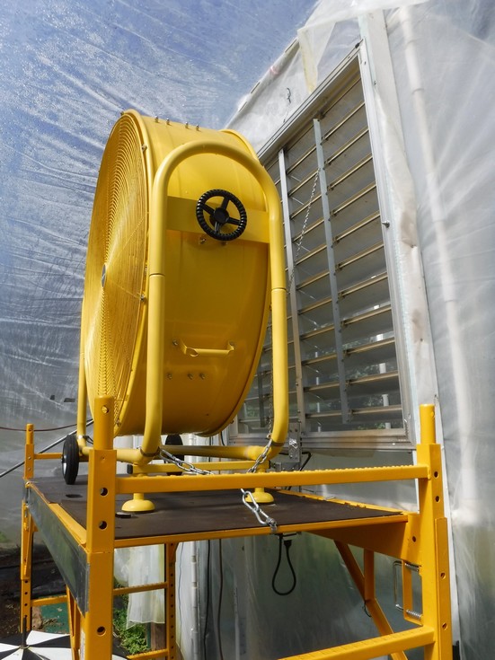 This fan could move a lot of air and worked well all season. It has two settings which allowed some flexibility. The low setting (9,000cfm) was the default and the high setting (15,000cfm) was used when temperatures were predicted to be 85+F for daytime highs to help move as much air through the structure as possible.