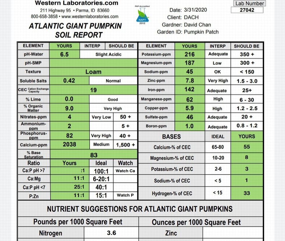 Soil sample taken March 1 2020. Last year nothing was grown on the pumpkin patch except a fall rye cover crop. It would seem like the soil is in pretty good shape for this year with some simple amendments to be added soon.