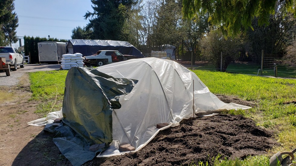 A temporary shelter to begin the process of warming the soil. The heating cables have also been plugged in. It's Miller time!!
