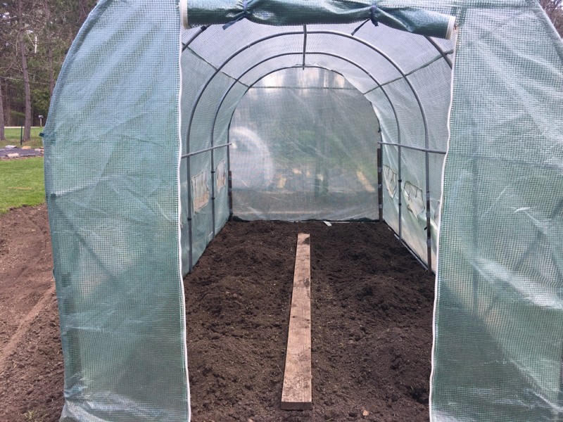 The greenhouse is 15 feet long by 7 feed wide. We have planting mounds warming up for 8 plants.