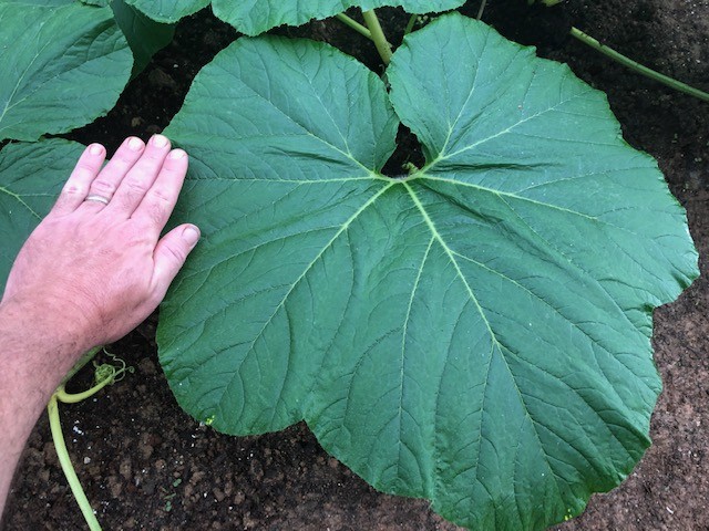 Here is my Henry the Giant Pumpkin grower hand photo. :-) Not sure when Henry posts his pics whether he has small hands or big leaves. If I was growing cabbage, I would be feeling pretty good right now. I might have New England sized leaves, they are measuring 26 inches for what its worth.