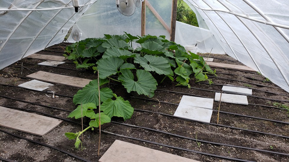 The Barron 1984 - 42 days post transplant. Trying to create a diamond pattern but after terminating the 1st and 2nd secondaries at the 3rd and 5th leaf, I've been reluctant to terminate others. Yesterday I culled a female at 9 ft. My goal is to get a female at 15 ft. My usual is 12 -13 ft. The leaves of all 3 plants are surprisingly large and green given that my soil analysis recorded "very low" nitrates. It could be that the cover crop of fall rye is breaking down very well or the addition of " Gaia Green"(4-4-4) to my vine burying mixture.