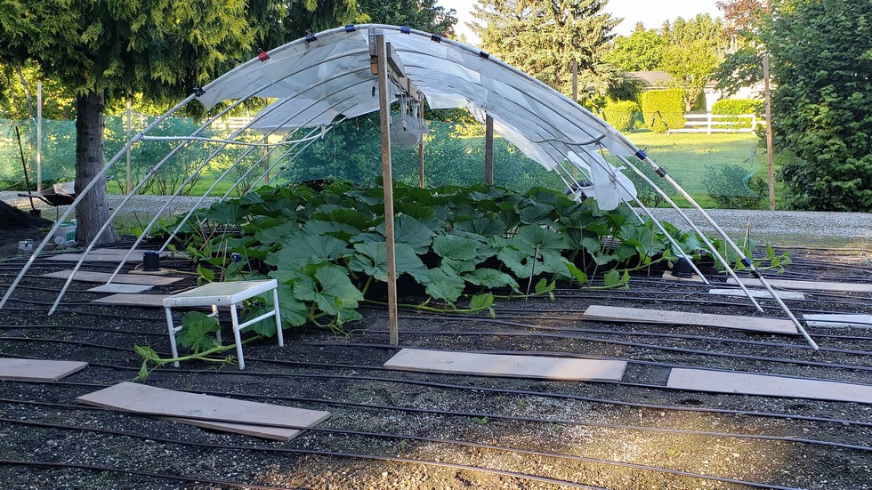 Barron 1984 57 days post transplant. A female at 18 ft ready to be pollinated today... hopefully. This is the longest main vine pre pumpkin I've ever had . I'm sure it's due to early terminations of the 1st 2 secondaries. Will be doing this on all future plants.