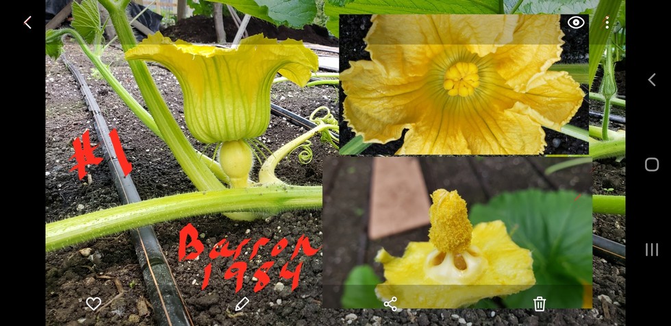 Barron 1984 today. First pollination at 15 ft with 12 secondaries on the right and 11 on the left. The 12th secondary is right on the main vine and stem of the pumpkin. Should I try to keep that one or not? Please email me your thoughts. Thanks