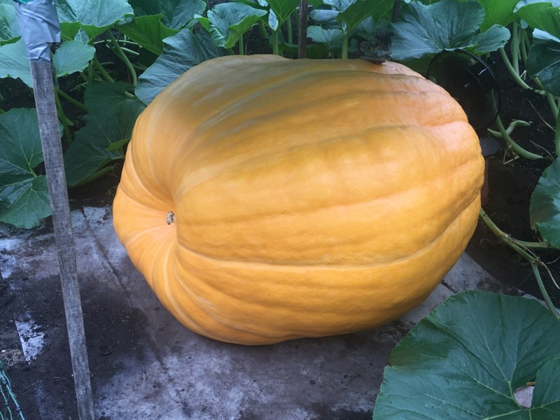 Here is the side view of Cora off our 1080 Young. She is a very long pumpkin with a wide face.