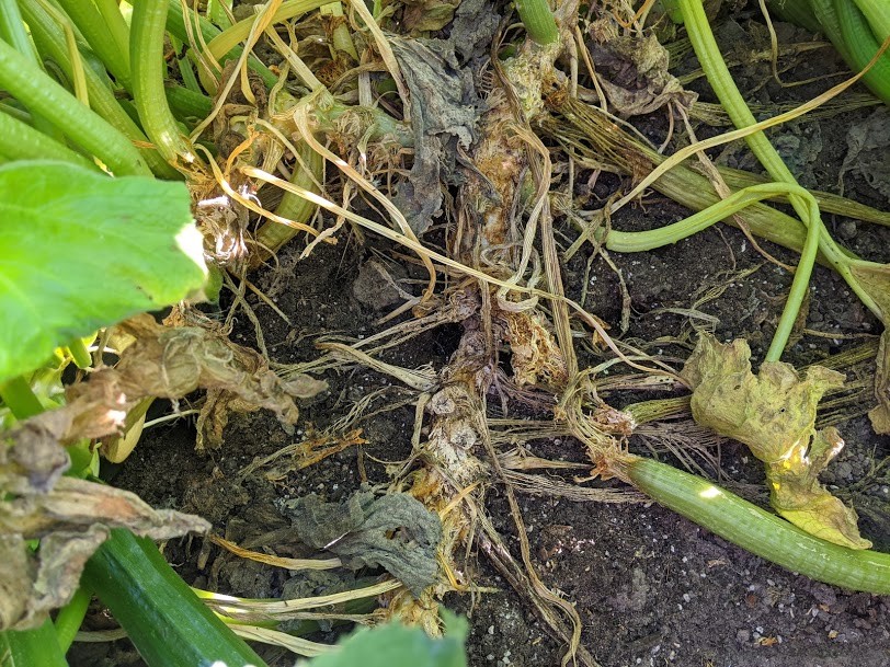 Although from the outside the giant zucchini plant looks good, just won't produce very big fruit. Looked a little deeper in the plant and this may have something to do with it. Looks like the core and main root died and 4 different vines have taken root. Now have 4 individual small plants. Might pull 3 and see what the last one will produce after it gets bigger or just give up all together on the giant zuke quest.