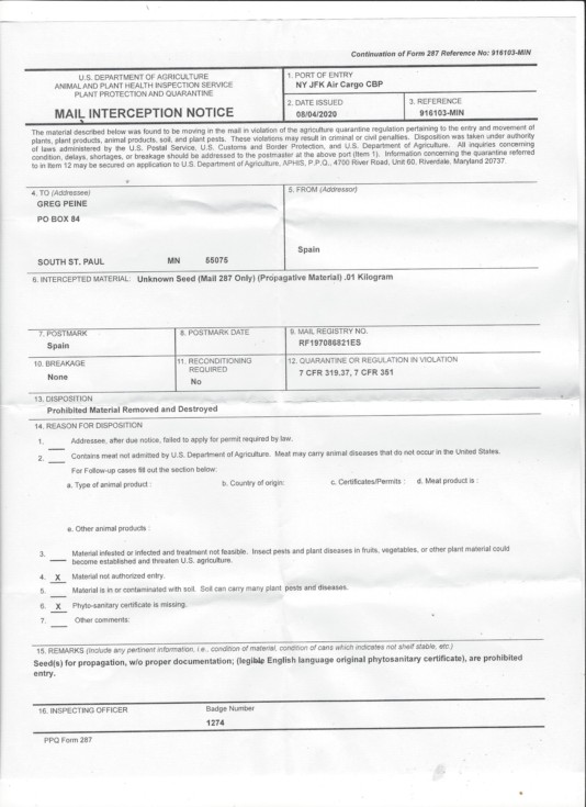 Instead of finding seeds in the package, I found this document saying that the seeds had been destroyed due to lack of a Phyto Sanitary certificate and the seeds were from an unknown origin.