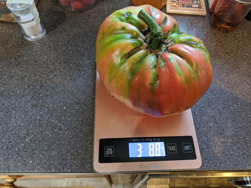 Picked the 4.28 Big Marley today. Slightly better effort than the first tomato but still too small to help our team be competitive. Measured slightly over 21" and weighed 3.55 lbs so pretty much right to chart.