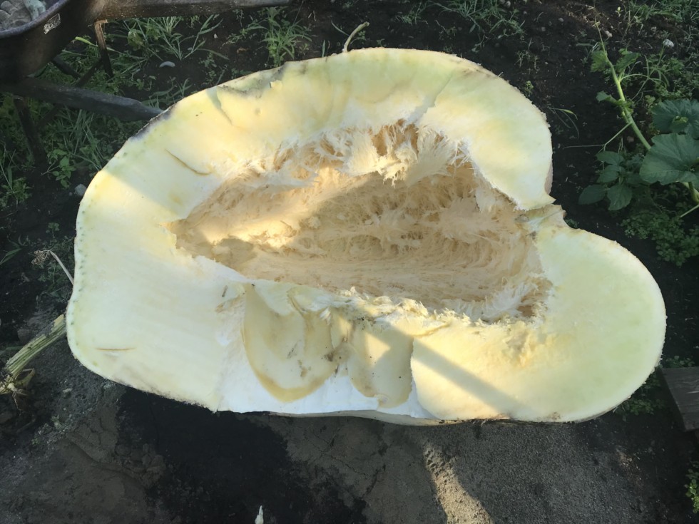 Cross section of the 1911 Wolf pumpkin showing blossom end split and fairly thick walls.