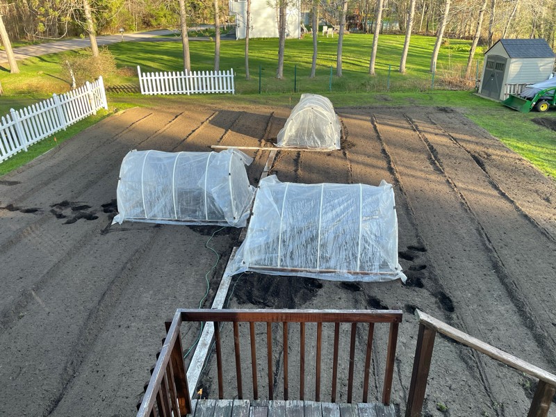 The tractor makes this so much easier as we used to move it to the patch by wheelbarrow. This is roughly 5 hours of work and around 9 yards on on this patch. Subsoiler was used in a checkerboard pattern and tilled 3 times. The soil heating cables are dug in and plugged in with the hoops in place. I will give the cables 5 days to heat the soil before planting Sunday or Monday.