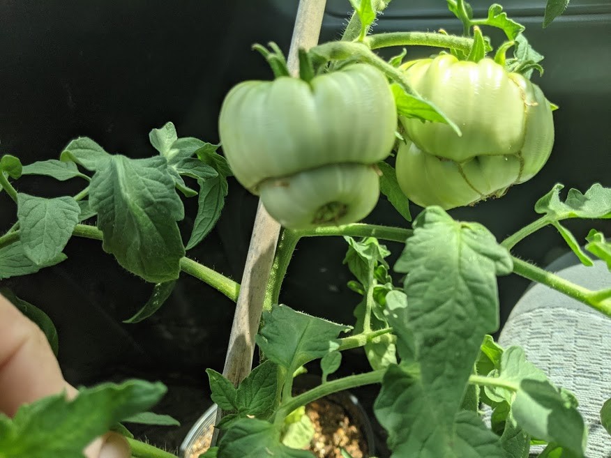 Test start to this year's diary. Overwintered last year's 5 gallon challenge plant inside for most of the winter. Was nice having fresh tomatoes into December. Before kicking the plant out of the seed starting greenhouse this spring took some cuttings of 3 of the vines and re-rooted them. All 3 had different shaped tomatoes. This one set 2 doubles, one inside the other. Curious shape.