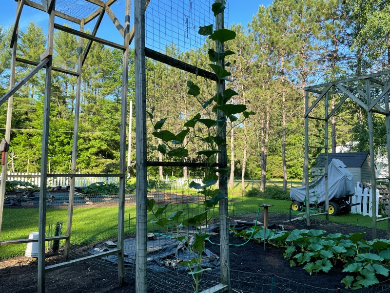 Here is the 146 LeBlanc next to the greenhouse. She has both mail and female blossoms coming and is 12 feet long tonight. Just 2.5 feet more and she will be on top of the trellis.