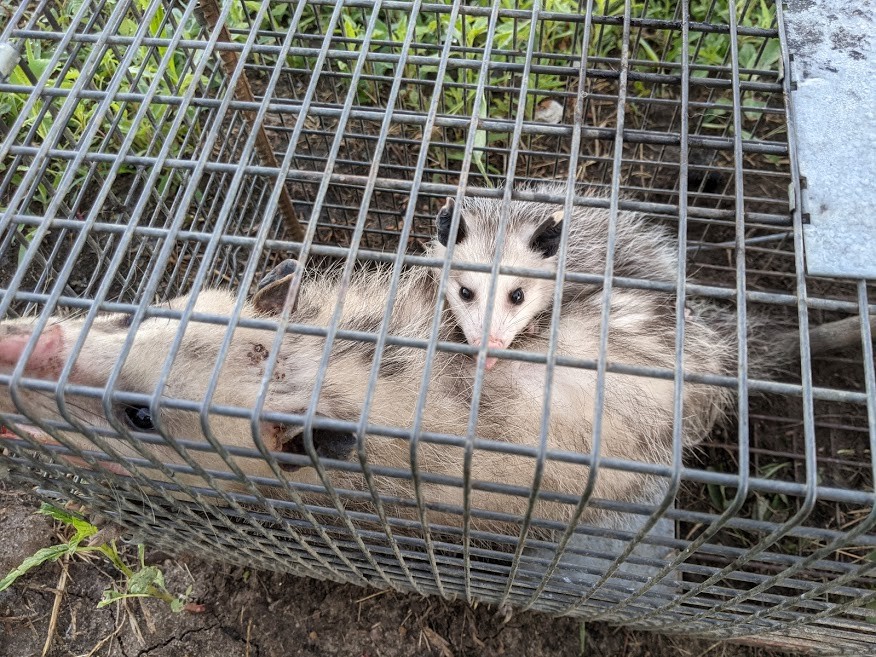 Time to reduce the number of nighttime garden visitors. First volunteers to relocate were this momma possum and her little hitchhiker.