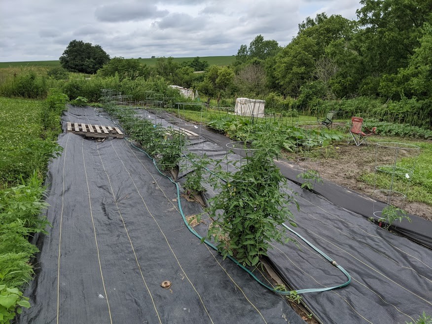 Competition tomatoes. In the patch are the 7.35 Brown, 7.66 Hill, 3.46 Konieczny, 8.83 La Rue, 7.19 La Rue, 6.72 La Rue, 5.98 MacDonald, 9.65 Marley, 6.55 Marley, 5.71 Marley, 5.29 Marley, 4.91 Parenty, 2.0 Parenty, 7.12 Sutherland, 5.23 Harrington, 4.01x Harrington, and 3.52 Harrington. Thought I had lost my last 9.65 last month. During the cool wet stretch had the plants under jugs trying to keep them warm. Had four plants rot off at ground level due to excess moisture under the jugs. Happen to catch in time that the top of the 9.65 was still green so was able to get it into some water and resprouted some roots to save it. As of today can't tell it from some other plants that were germinated from seed at the same time.
