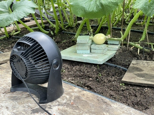 7 DAP fruit on my 1911 Urena. I feel fortunate to have it finally. But it�s position is poor, on a secondary with not much plant behind it. I will be lucky to get 15# per day. I learn something new every year from my mistakes. I did 2 pollinations on the 1875 Mendi yesterday. My poor little 2096 Meier is finally showing some vine growth with a little baby now peeking out of the tip of one of the strongest secondaries.