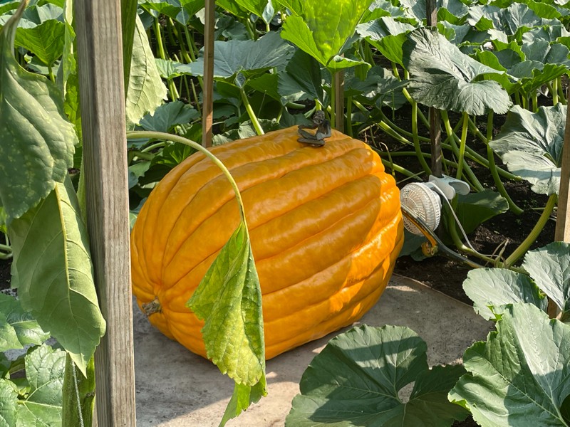Side view of Grandma Josephine from the 1215 Young. Nothing in the patch is growing fast this year an we are way behind a few of our best years but overall we are very pleased and have a few unique looking fruits. It is typical for a grower to be concerned by 1 or 2 areas on each pumpkin they grow as these are potential split areas. This year on the 1215 we have at least 12 worry zones. It will be a miracle if we can get it to a weigh off!