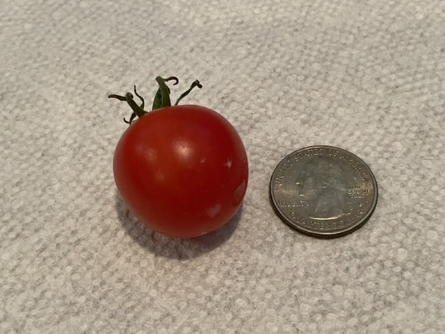 On the flip side of gigantitude, here is a fruit from my 5.95 Konieczny Domingo plant. All the blossom trusses had 6 blooms & each had 6 sepals, typical red cherry. Some sort of seed mixup I guess. I am (intentionally) growing 2 cherry tomatoes , one orange & the other multicolor but this isn�t one of those. Umm, I forgot to weigh this one, ha!
